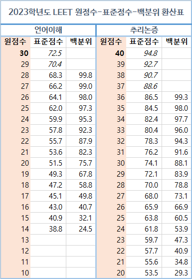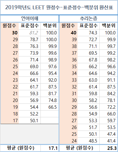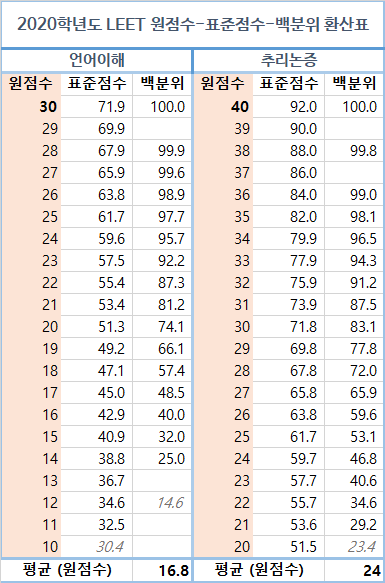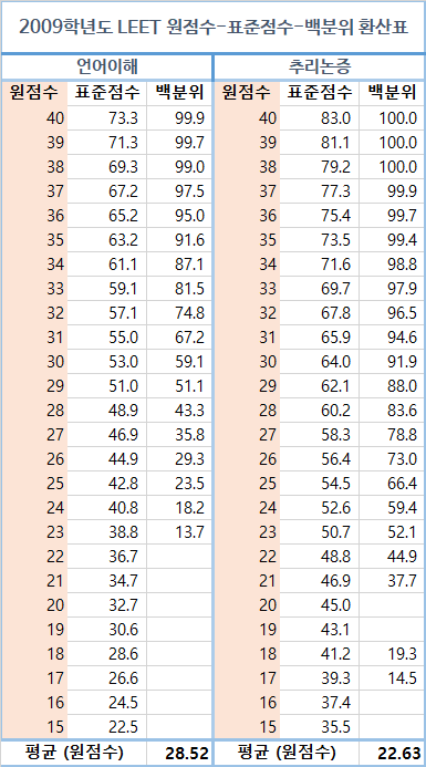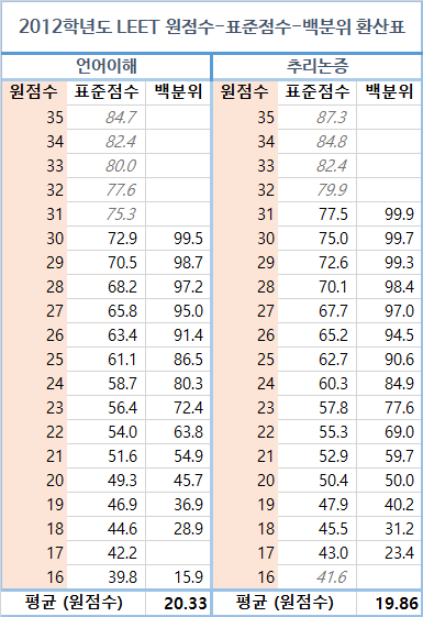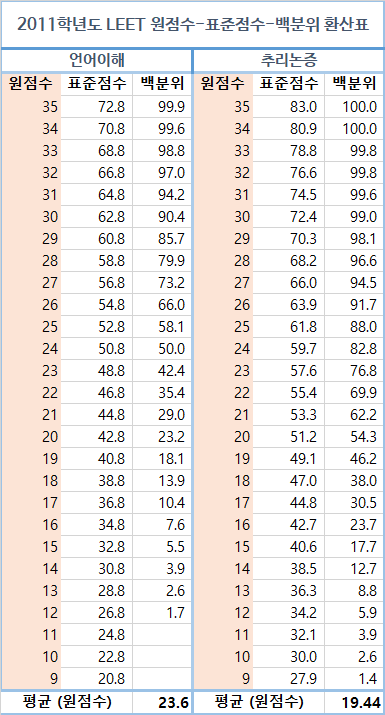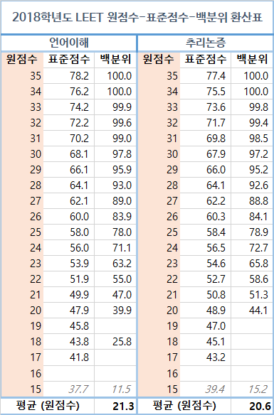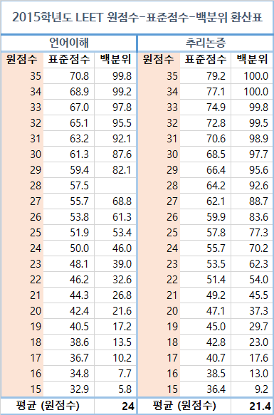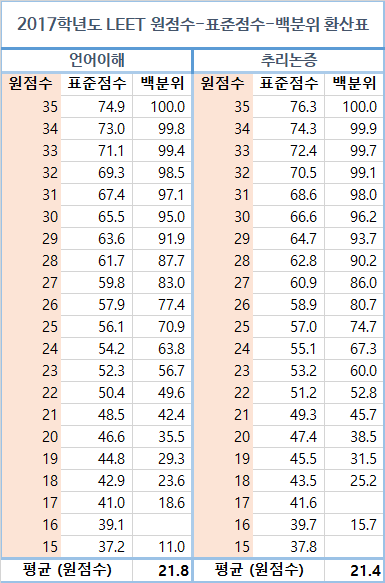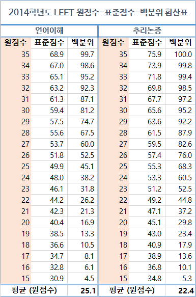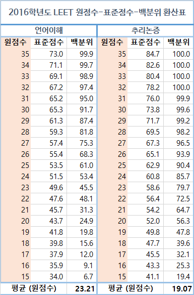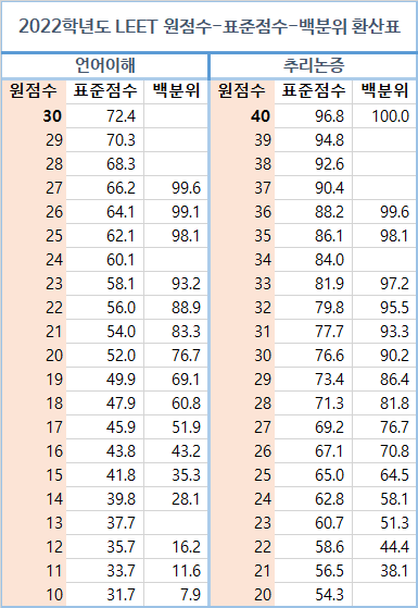| 2023학년도 LEET(법학적성시험) 표준점수 백분위 환산표 (0) | 2022.12.12 |