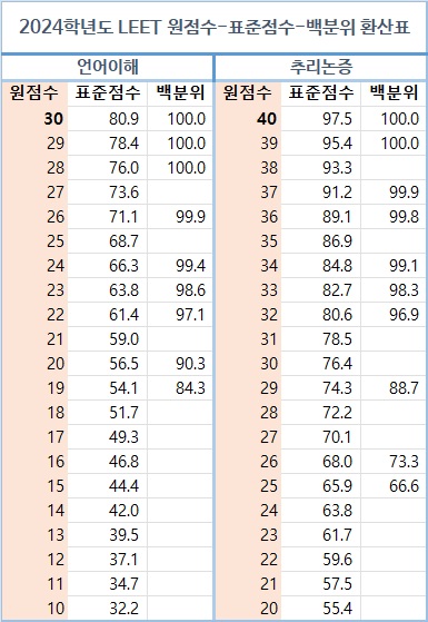 | 2024학년도 LEET(법학적성시험) 표준점수 백분위 환산표 (0) | 2024.02.22 |