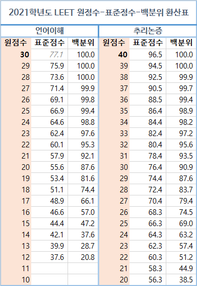 | 2022학년도 LEET(법학적성시험) 표준점수 백분위 환산표 (1) | 2021.11.16 |